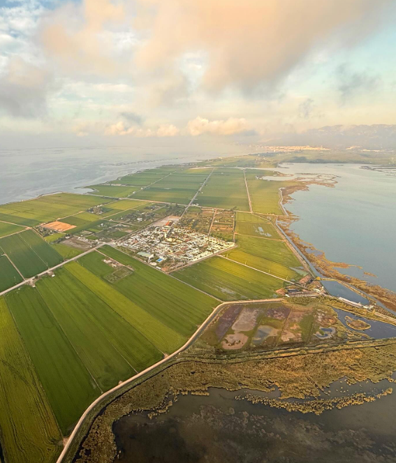 Desde el cielo, disfrutará de vistas panorámicas del Delta del Ebro, Reserva de la Biosfera de la UNESCO, en todo su esplendor: el sinuoso río Ebro, exuberantes arrozales verdes, lagunas vibrantes, granjas de mejillones, amplias bahías y playas naturales vírgenes, todo ello bañado por la mágica luz del amanecer.